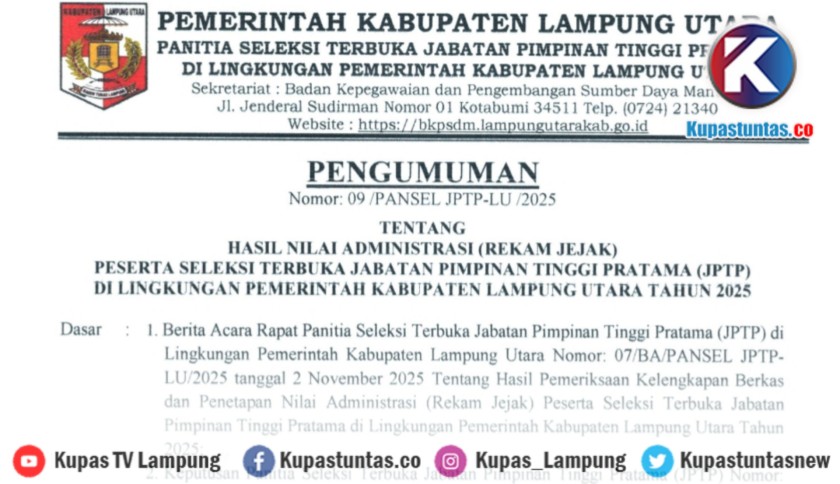 Senin, 03 November 202519 Peserta Lulus Seleksi Administrasi JPTP Lampung Utara, Berikut Daftarnya