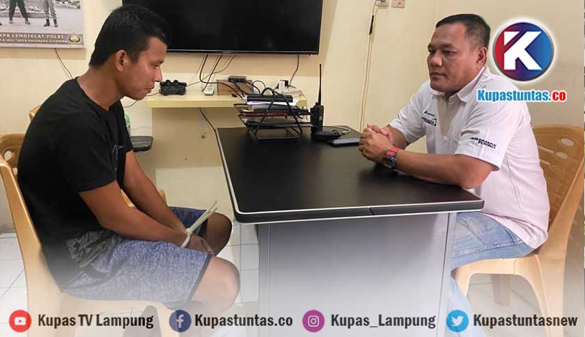 Govanda (Kaos hitam) saat diinterogasi Kanit Jatanras Polresta Bandar Lampung, Ipda Thamrin Lumban Gaol. Foto: Martogi/Kupastuntas.co