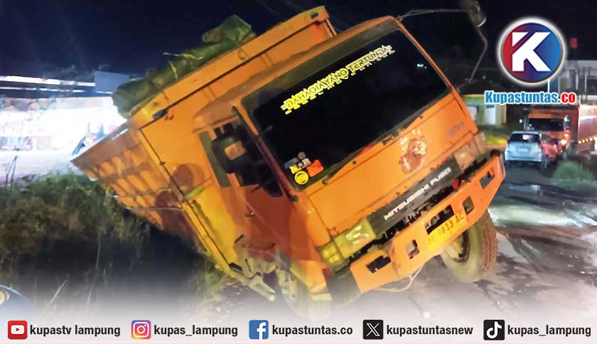 Tampak truk Fuso yang terdampar di parit usai gagal menanjak di Jalan Raya Podosari, Kecamatan Pringsewu, Kabupaten Pringsewu, pada Minggu (21/9). Foto: Ist