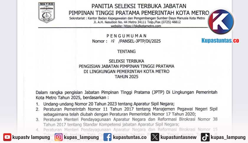 Kupastuntas.co, Metro - Pemerintah Kota Metro resmi membuka Seleksi Terbuka (Selter) untuk mengisi tiga Jabatan Pimpinan Tinggi Pratama (JPTP) eselon II-B, sebagai bagian dari upaya menempatkan aparatur terbaik pada posisi strategis.