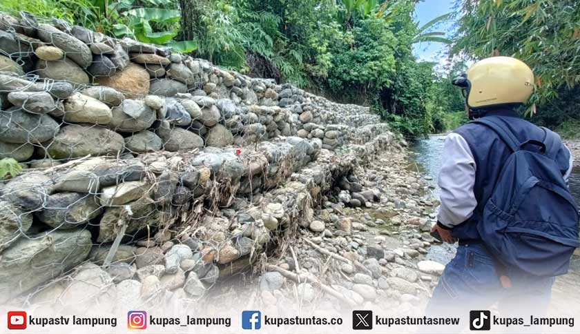 Penampakan proyek beronjong di Pekon (Desa) Hantatai, Kecamatan Bandar Negeri Suoh (BNS), Lampung Barat yang digadang-gadang sebagai penahan banjir namun kini menuai keluhan warga. Foto: Echa/Kupastuntas.co