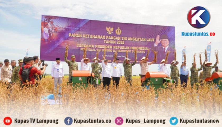 Kupastuntas.co, Bandar Lampung - Menteri Pertahanan (Menhan) Sjafrie Sjamsoeddin bersama Menteri Pertanian (Mentan) Andi Amran Sulaiman dan Panglima TNI Jenderal Agus Subiyanto melakukan panen raya kedelai varietas Garuda Merah Putih di lahan seluas 30 hektare di Permukiman TNI Angkatan Laut (Kimal), Desa Madukoro, Kecamatan Kotabumi Utara, Kabupaten Lampung Utara (Lampura), Rabu (29/10/2025).