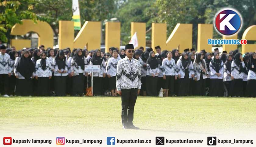 Kupastuntas.co, Lampung Tengah - Gubernur Lampung, Rahmat Mirzani Djausal memimpin upacara peringatan Hari Ulang Tahun (HUT) ke-80 Persatuan Guru Republik Indonesia (PGRI) dan Hari Guru Nasional 2025 tingkat Provinsi Lampung di Lapangan Merdeka, Gunung Sugih, Lampung Tengah, Selasa (25/11/2025).
