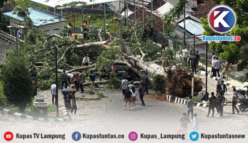 Kupastuntas.co, Bandar Lampung - Sebuah pohon randu berdiameter sekitar dua meter tumbang dan menimpa dua kendaraan di area pintu keluar Hotel Holiday Inn Bandar Lampung, Selasa (23/12/2025) sekitar pukul 10.30 WIB.