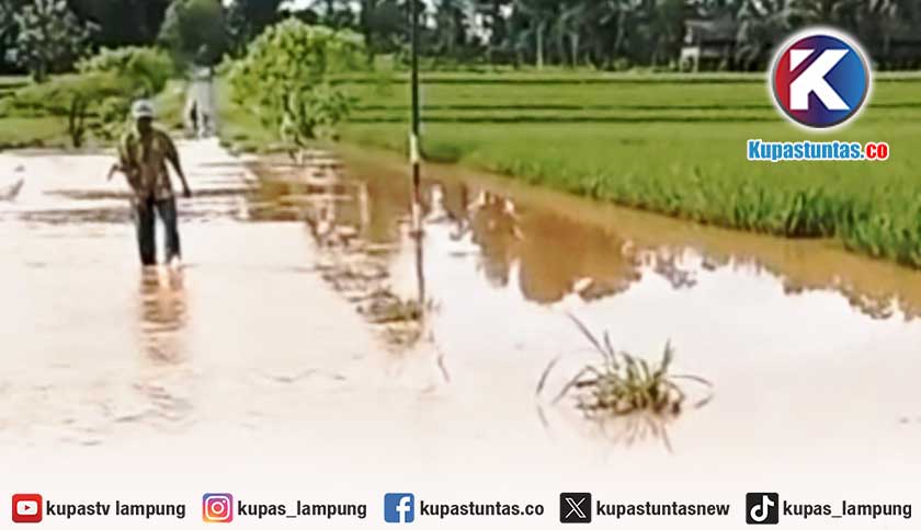 Kupastuntas.co, Lampung Timur - Ratusan hektare tanaman padi di Desa Braja Emas, Kecamatan Way Jepara, Kabupaten Lampung Timur, terancam gagal panen akibat terendam luapan air hujan.