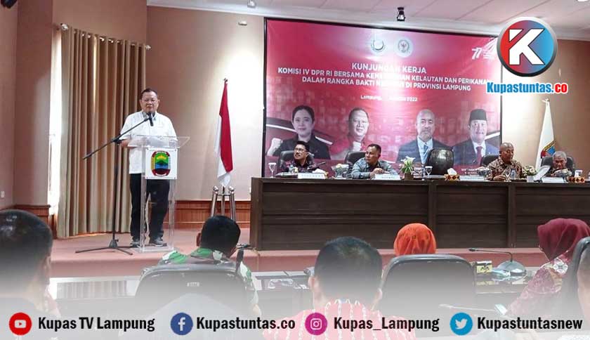 Ketua Komisi IV DPR RI, Sudin, saat kunjungan kerja bersama Dirjen Perikanan Tangkap Kementerian Kelautan dan Perikanan RI, Ir Muhammad Zaini, di Aula Krakatau Setdakab Lamsel, Jumat (12/08/2022). Foto: Handika/kupastuntas.co