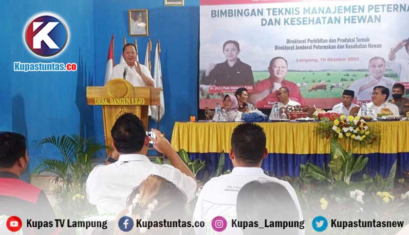 Ketua Komisi IV DPR RI, yang juga Ketua DPD PDI Perjuangan Lampung, Sudin saat Bimtek manajemen peternakan dan kesehatan hewan di Balai Desa Bangunrejo, Kecamatan Ketapang, Rabu (19/10/2022). Foto: Handika/kupastuntas.co