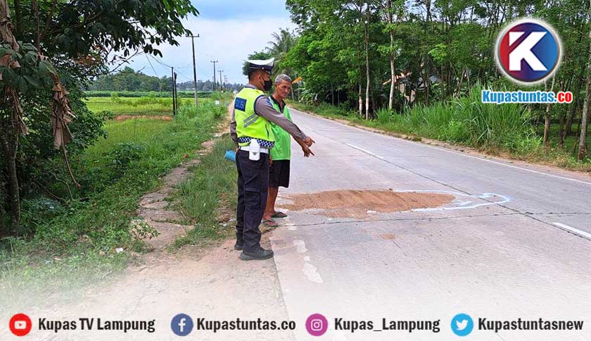 Polisi menunjuk TKP tabrak lari di Jati Agung, Lamsel yang menyebab kan 1 orang meninggal dunia. Jumat (21/10/2022). Foto: Handika/Kupastuntas.co