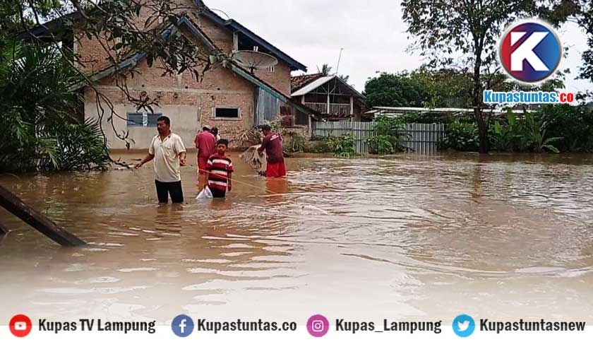Tampak sebagian warga saat menjaring ikan di tengah suasana banjir yang mengepung di perkampungan mereka, di Dusun Sidosari, Desa Sidorejo, Kecamatan Sidomulyo, Kabupaten Lampung Selatan. Foto: Handika/Kupastuntas.co