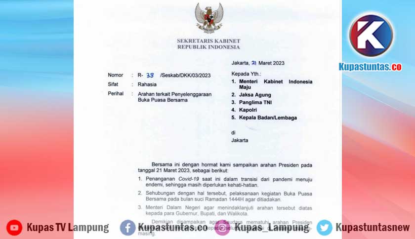 Instruksi Presiden Joko Widodo Nomor: R-38/Seskab/DKK/03/2023 perihal penyelenggaraan buka puasa bersama ter tanggal 21 Maret 2023. Foto: Foto: Dokumen.