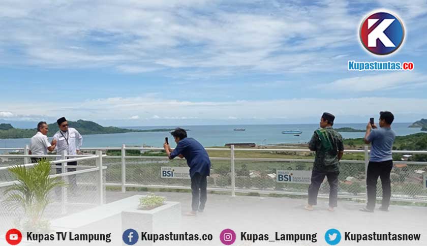 Keseruan masyarakat berfoto ria dari Masjid BSI Bakauheni dan beribadah sholat Jumat berjamaah. Jumat (31/3/2023). Foto: Handika/kupastuntas.co