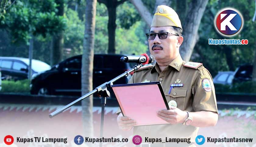 Sekdakab Lamsel, Thamrin saat memberikan arahannya pada apel mingguan di Lapangan Kopri, Lamsel. Senin, (12/6/2023). Foto: Ist.