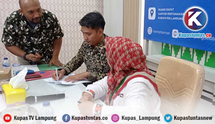 Kepala Kantah ATR/BPN Lamsel, Seto Apriyadi saat membubuhkan tandatangan persetujuan redistribusi tanah. Kamis (22/6/2023). Foto: Handika/kupastuntas.co