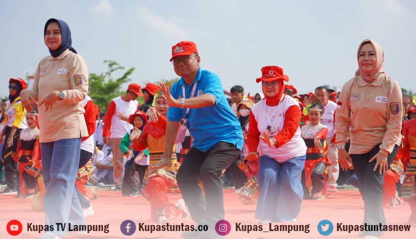 Ketua Pelaksana Jumbara PMR Tingkat Nasional ke-IX Sasongko Tedjo (kaos biru) ikut menari pada acara penutupan. Minggu (9/7/2023). Foto: Handika/Kupastuntas.co