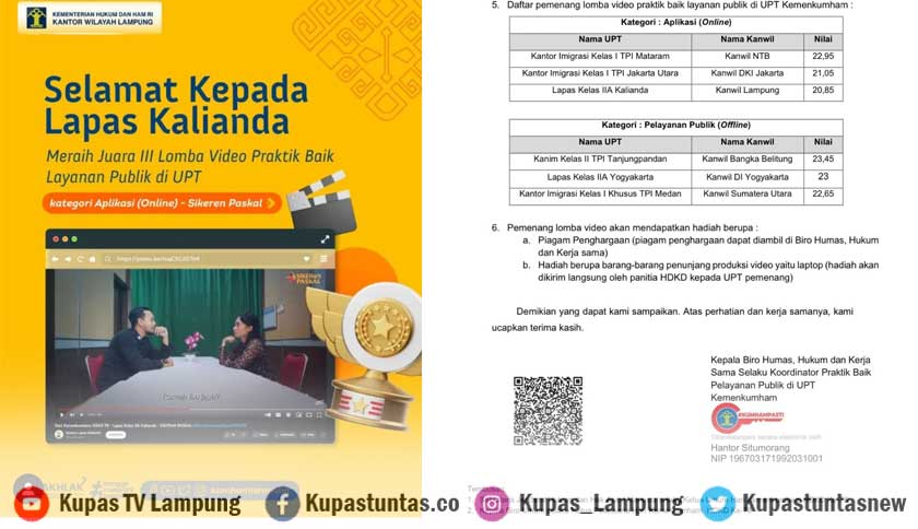 "Selamat kepada Lapas Kalianda yang telah meraih Juara III video praktik baik layanan publik di UPT, kategori aplikasi online Sikeren Paskal," bunyi postingan akun tersebut. (*)