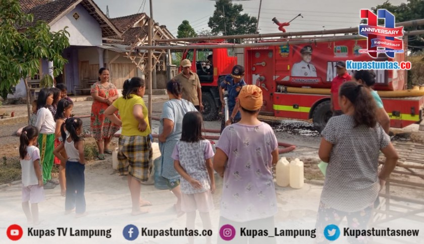 Kupastuntas.co, Lampung Selatan - Dinas Pemadam Kebakaran dan Penyelamatan (Damkarmat) Kabupaten Lampung Selatan (Lamsel) mendistribusikan 36.000 liter air bersih kepada warga yang terdampak cuaca kemarau.