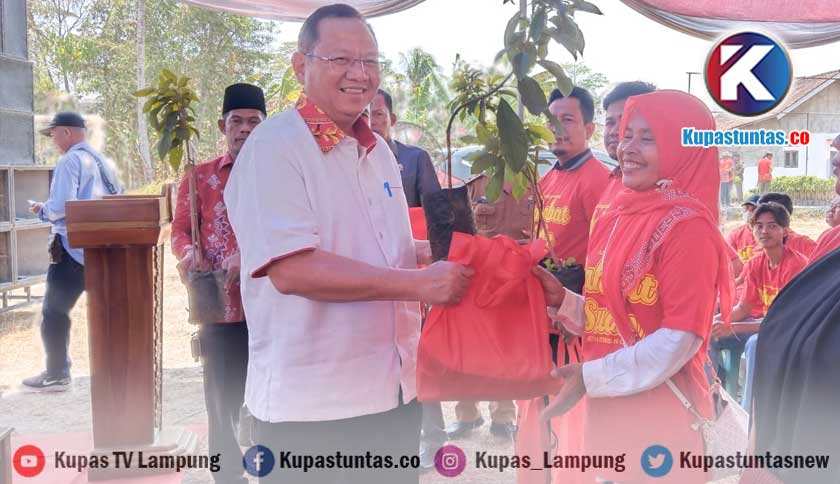 Ketua Komisi IV DPR RI, Sudin memberikan bantuan bibit tanaman produktif yaitu alpukat siger kepada masyarakat, saat menghadiri acara Sosialisasi dan Bimtek Pelaksanaan Rehabilitasi Hutan dan Lahan (RHL) di Desa Taman Sari, Kecamatan Ketapang, Kabupaten Lampung Selatan, Selasa (31/10/2023). Foto: Ria/Kupastuntas.co