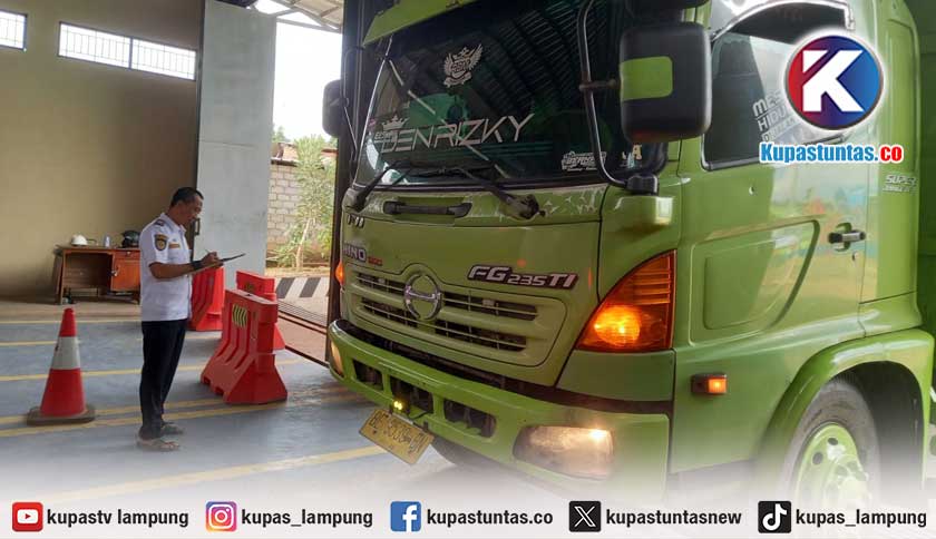 Petugas UPT KIR Dishub kota Bandar Lampung, saat melakukan uji KIR, Senin (22/4/2024). Foto: Sri/kupastuntas.co