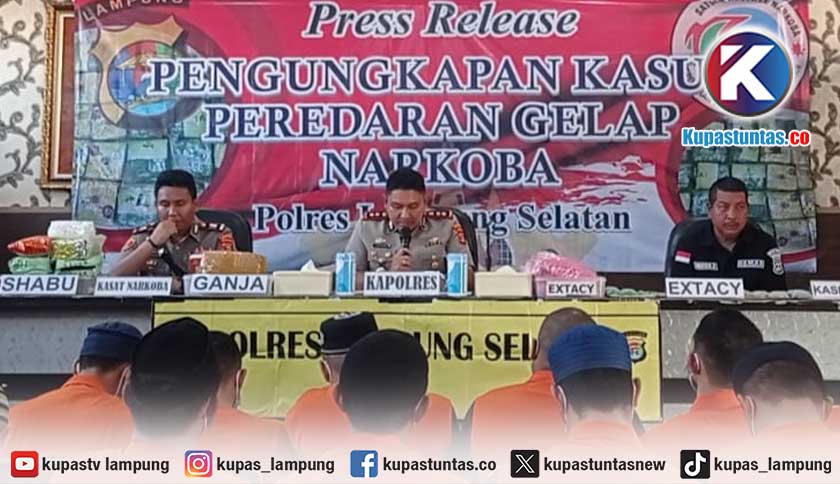 Kapolres Lamsel AKBP Yusriandi Yusrin (tengah) saat konferensi pers. Jumat (28/6/2024). Foto: Handika/Kupastuntas.co