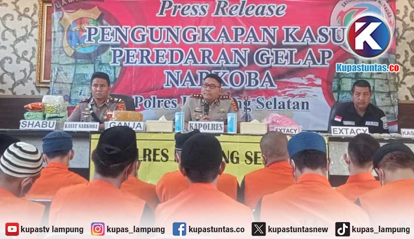 Kapolres Lamsel AKBP Yusriandi Yusrin (tengah) memimpih Konferensi Pers tentang ungkap kasus narkoba di Polres setempat. Jumat (28/6/2024). Foto: Handika/Kupastuntas.co