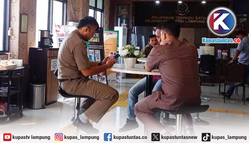 Pegawai Satpol PP Lamsel terlihat di ruang tunggu Kejari Lamsel untuk menjalani pemeriksaan oleh BPKP Provinsi Lampung. Kamis (11/7/2024). Foto: Handika/kupastuntas.co