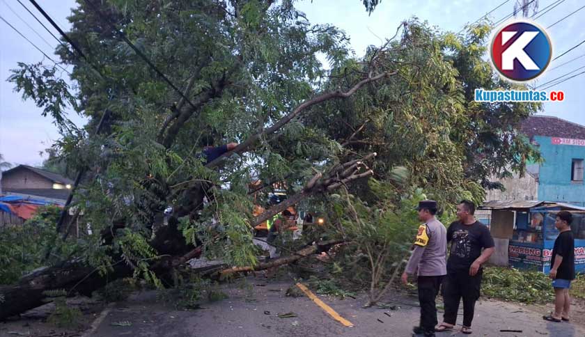 Kupastuntas.co, Pringsewu – Hujan deras disertai angin kencang yang mengguyur Kabupaten Pringsewu sejak Rabu malam memicu rangkaian kejadian, salah satunya tumbangnya pohon Trembesi berukuran besar di Jalan Lintas Barat Sumatera (Jalinbar) Pekon Tambahrejo Barat, Kecamatan Gadingrejo, Kamis (11/12/2025) sekitar pukul 04.15 WIB. Pohon berusia puluhan tahun tersebut roboh melintang dan menutup seluruh badan jalan, membuat arus kendaraan dari dan menuju Bandar Lampung sempat lumpuh total.