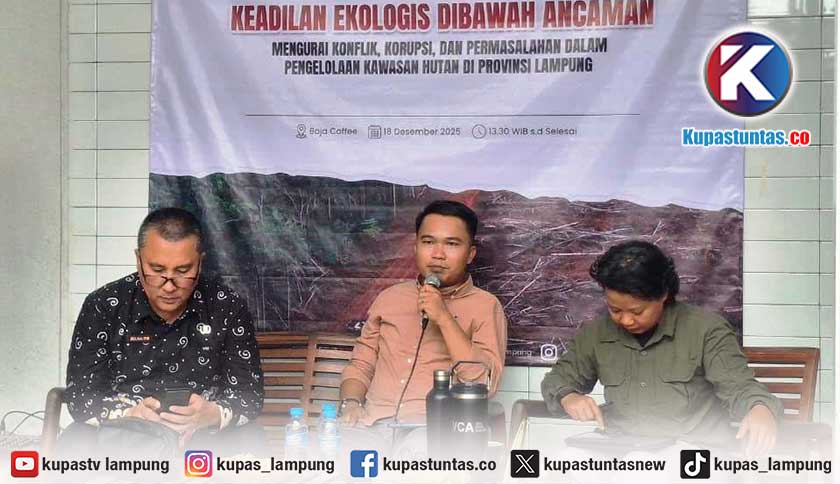 Direktur Wahana Lingkungan Hidup Indonesia (WALHI) Lampung, Irfan Tri Musri (tengah), saat diskusi publik bertema pengelolaan kawasan hutan di Bandar Lampung, Kamis (18/12/2025). Foto: Yudi/kupastuntas.co