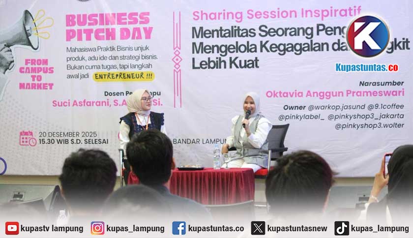Kupastuntas.co, Bandar Lampung — Himpunan Mahasiswa Administrasi Bisnis Universitas Bandar Lampung (HIMABI UBL) sukses menyelenggarakan Sharing Session Inspiratif bertema “Mentalitas Seorang Pengusaha Mengelola Kegagalan dan Bangkit Lebih Kuat” bersama praktisi bisnis muda, Oktavia Anggun Prameswari, owner @warkop.jasund, @9.1coffee, @pinkylabel_, @pinkyshop3_jakarta, dan @pinkyshop3.wolter.