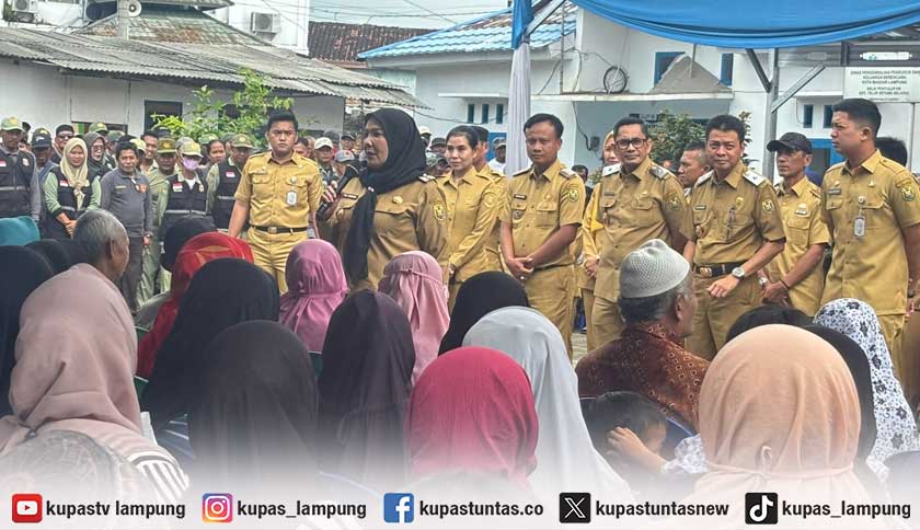 Wali Kota Bandar Lampung, Eva Dwiana saat membagikan beras bantuan kepada warga di Kantor Kecamatan Teluk Betung Selatan, Senin (9/3/2026). Foto: Sri/Kupastuntas.co