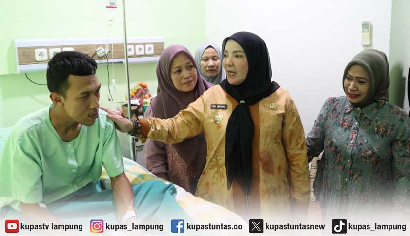 Dalam kunjungannya di Rumah Sakit Advent Bandar Lampung, Kamis (16/4/26), Eva Dwiana memberikan bantuan berupa uang tunai sebesar Rp15 juta serta umrah untuk meringankan beban korban.