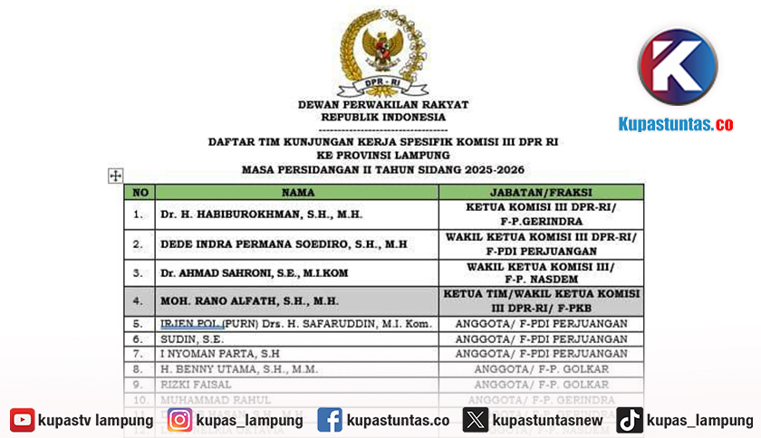 Kupastuntas.co, Bandar Lampung - Komisi III DPR RI melaksanakan kunjungan kerja spesifik ke Provinsi Lampung dalam masa persidangan IV tahun sidang 2025–2026, Kamis (16/4/2026).