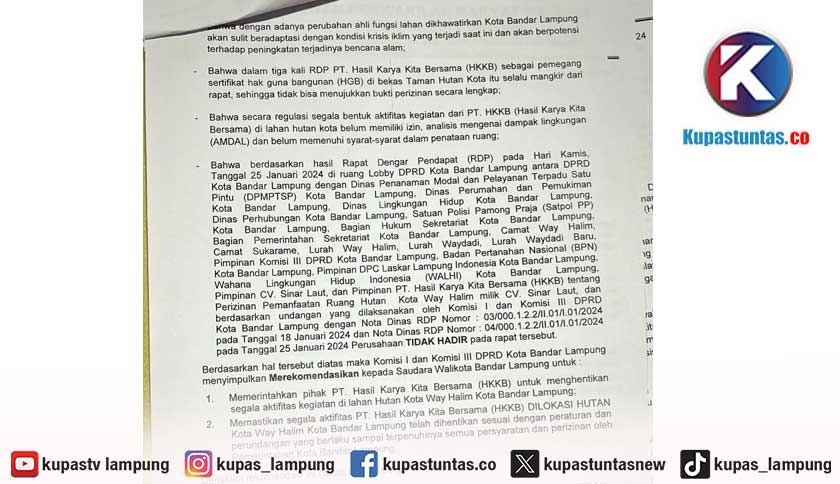 DPRD Bandar Lampung Rekomendasi Penghentian Aktivitas PT HKKB di Eks Hutan Kota
