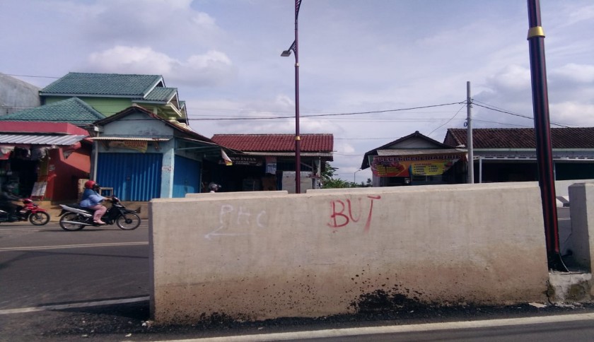 Coretan tersebut bertuliskan "BUT 73 my home" nampak coretan berwarna merah terlihat dari sisi sebelah kanan jika pengendara masuk lewat bawah dari bypass menuju Jalan Untung Suropati.