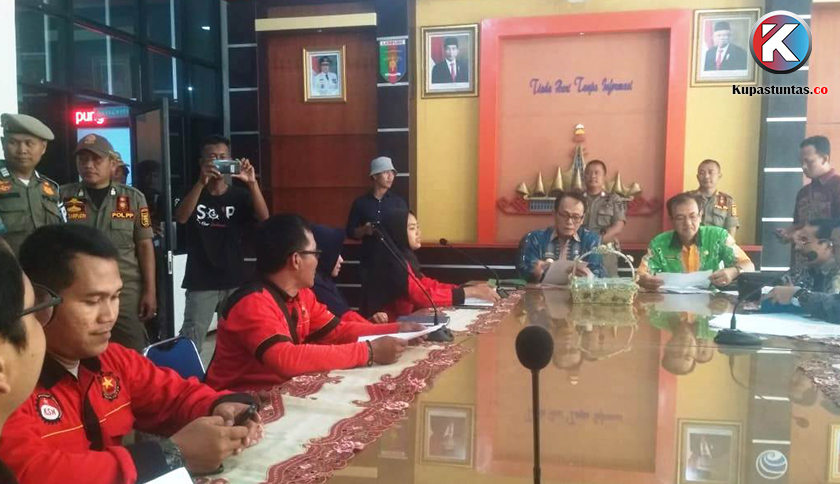 Kepala Dinas Tenaga Kerja dan Transmigrasi Lukmansyah menerima perwakilan massa demo penolakan RUU Omnibus Law di ruang rapat utama Dinas Komunikasi dan Informasi, Kamis (20/2/2020). Foto: Siti/Kupastuntas.co