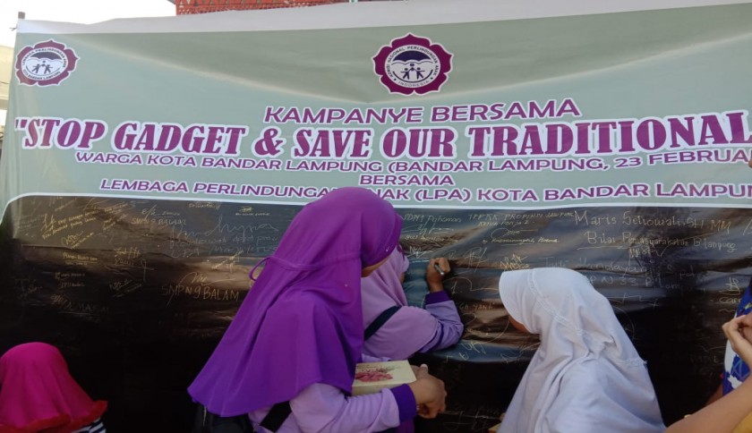 Atas hal itu, Lembaga Perlindungan Anak (LPA) kota Bandar Lampung, mengkampanyekan untuk stop gadget dan save our traditional game. didepan Gramedia Lampung, Minggu (23/2/2020). Dengan tema anak bandar Lampung tumbuh dan berkembang tanpa gadget.