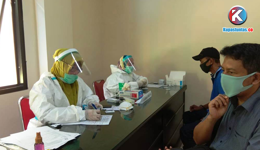 Petugas medis puskesmas wayhalim Bandar Lampung sedang melakukan cek kesehatan kepada warga yang akan melakukan perjalanan keluar kota, Senin (8/7/2020). Foto: Sri/Kupastuntas.co
