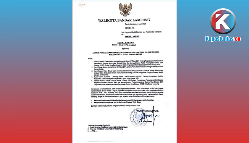 Hal tersebut tertuang dalam Surat Edaran Walikota Nomor 430 Tahun 2021 tentang Anjuran Pembacaan Ayat-ayat Suci Al-Quran dan Shalawat Tibbil Qulub di Seluruh Mushola/Masjid Kota Bandar Lampung.