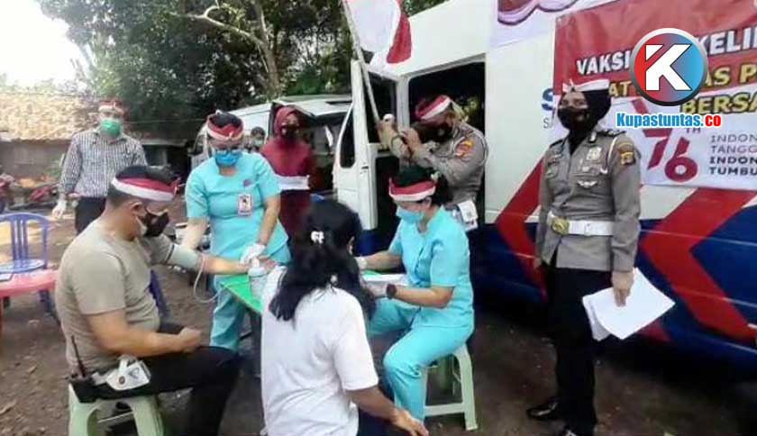 Kupastuntas.co, Bandar Lampung - Menyambut HUT Republik Indonesia (RI) yang ke-76, Warga Kelurahan Durian Payung, Tanjungkarang Pusat, Bandar Lampung antusias ikuti vaksin gratis yang digelar Satuan Lalulintas (Satlantas) Polresta Bandar Lampung, Selasa (3/8/2021).