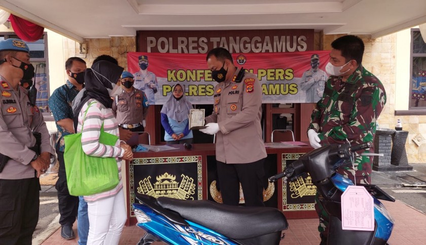 Penyerahan sepeda motor Yamaha Mio BE 4731 VG tersebut, diserahkan langsung Kapolres Tanggamus, AKBP Satya Widhy Widharyadi didampingi Dandim 0424/Tanggamus, Letkol Inf. Arman Aris Sallo kepada pemiliknya, Titian Ningsih (35), warga Pasarmadang, Kecamatan Kotaagung, Kabupaten Tanggamus, di Mapolres Tanggamus.