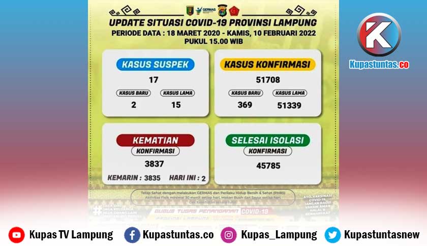 Kupastuntas.co, Bandar Lampung - Dinas Kesehatan Provinsi Lampung mencatat pasien terkonfirmasi positif Covid-19 didaerah setempat kembali bertambah sebanyak 369 orang sehingga saat ini totalnya menjadi 51.708 kasus, Kamis (10/2/2022).