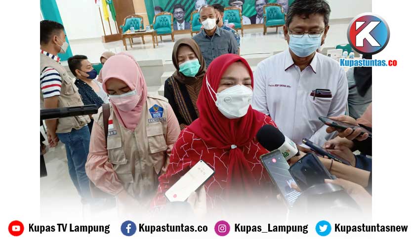 Walikota Bandar Lampung, Eva Dwiana, saat dimintai keterangan usai hadiri pelaksanaan vaksinasi booster batch I di Aula Fakultas Pertanian Unila, Minggu (20/2/2022). Foto: Sri/Kupastuntas.co