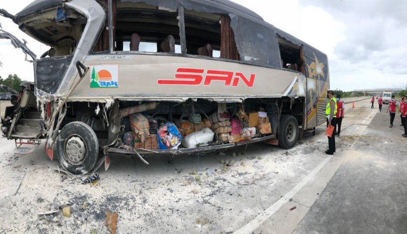 Kupastuntas.co, Bandar Lampung - Kecelakaan lalu lintas yang melibatkan kendaraan Bus besar dengan plat nomor kendaraan BD 7036 CZ dan kendaraan Truk Golongan II dengan plat nomor kendaraan BG 8765 UW terjadi di KM 35+000 jalur A jalan tol trans sumatera (JTTS) Ruas Bakauheni – Terbanggi Besar pada Jumat, (25/2/2022) pukul 15:07 WIB.