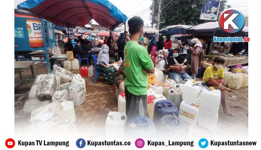 Kupastuntas.co, Bandar Lampung - Puluhan warga sekaligus pedagang menyerbu minyak goreng curah yang disalurkan ke beberapa pasar di Bandar Lampung salah satunya Pasar Tugu Bandar Lampung, Jumat (25/2/2022).
