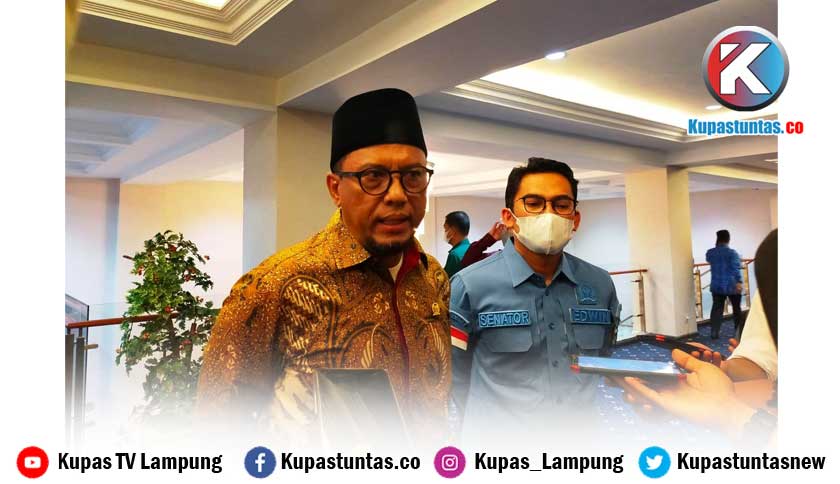 Anggota DPD RI Ahmad Bastian SY (kiri) saat dimintai keterangan usai menggelar rapat dengar pendapat (RDP) dengan Gubernur Lampung Arinal Djunaidi, Kamis (17/3/2022). Foto:Ria/Kupastuntas.co