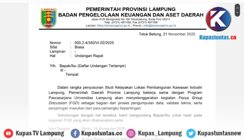 Jumat, 21 November 2025Pemprov Lampung Gelar FGD Penyusunan Studi Kelayakan Kawasan Industri