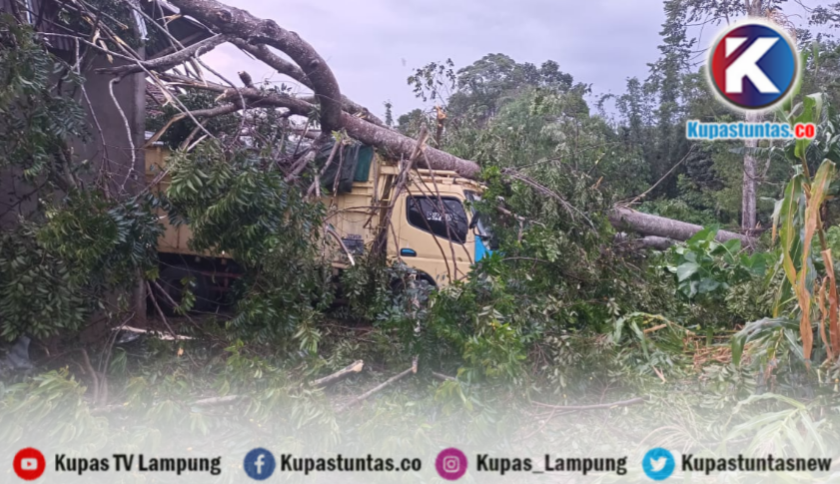 Tampak sebuah mobil truk tertimpa pohon tumbang di Lampung Barat. Foto: Ist