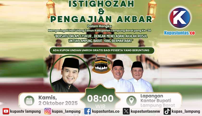 Kupastuntas.co, Lampung Barat - Ribuan masyarakat Lampung Barat diprediksi akan memadati Lapangan Kantor Bupati pada Kamis (2/10/2025). Pasalnya, peringatan HUT ke-34 Kabupaten Lampung Barat tahun ini akan dimeriahkan dengan istighosah dan pengajian akbar bersama ustaz kondang, H. Hilman Fauzi, S.E.I., M.E.Sy.