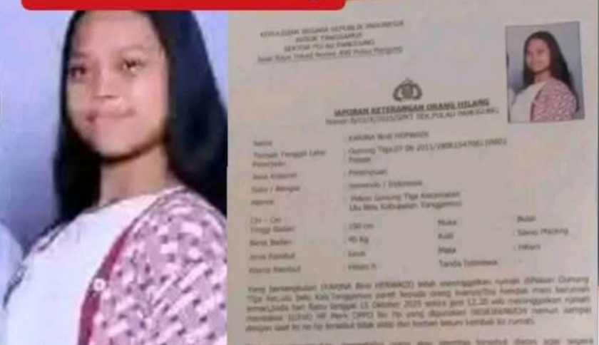 Kupastuntas.co, Tanggamus – Seorang pelajar SMP bernama Karina binti Herwadi (14), warga Pekon Gunung Tiga, Kecamatan Ulubelu, Kabupaten Tanggamus, Lampung, dilaporkan hilang oleh pihak keluarga sejak Rabu, 15 Oktober 2025. Hingga kini, gadis remaja tersebut belum juga kembali ke rumah.