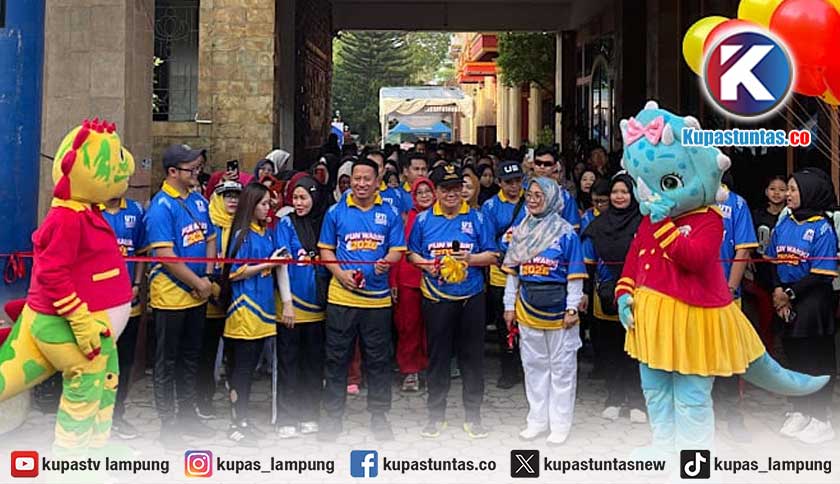 Kupastuntas.co, Bandar Lampung — Rektor Universitas Teknokrat Indonesia (UTI) Dr. HM Nasrullah Yusuf, SE., MBA., melepas peserta jalan sehat keluarga besar sivitas akademika serta masyarakat umum di halaman Rektorat kampus, Minggu (19/10/2025).