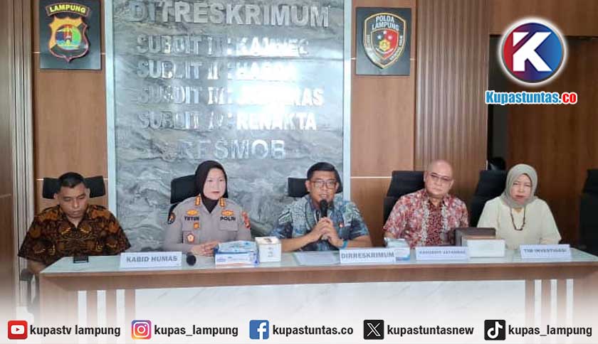 Direktur Reserse Kriminal Umum (Dirkrimum) Polda Lampung, Kombes Pol Indra Hermawan, saat memberikan keterangan kepada awak media dalam konferensi pers di Mapolda setempat. Foto: Yudi/Kupastuntas.co